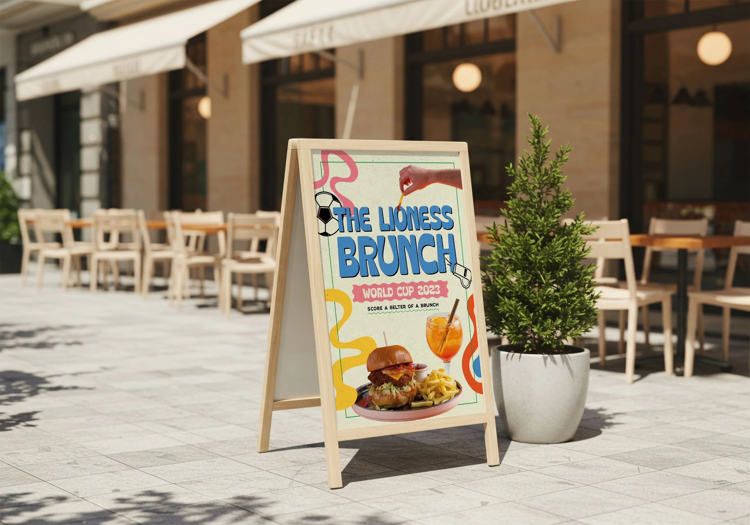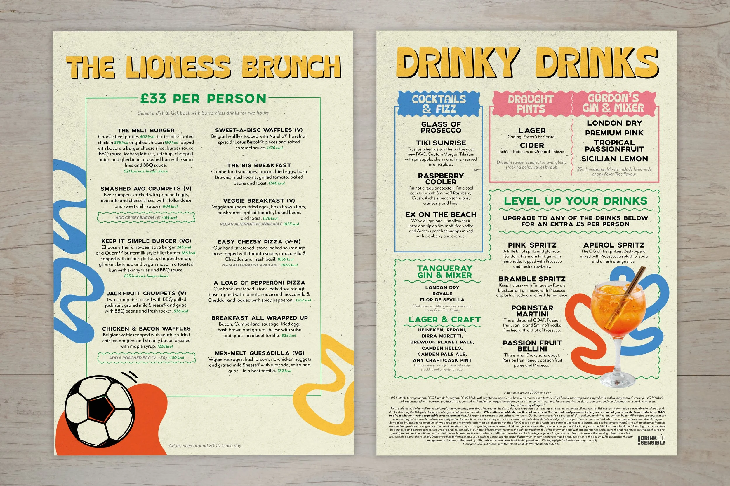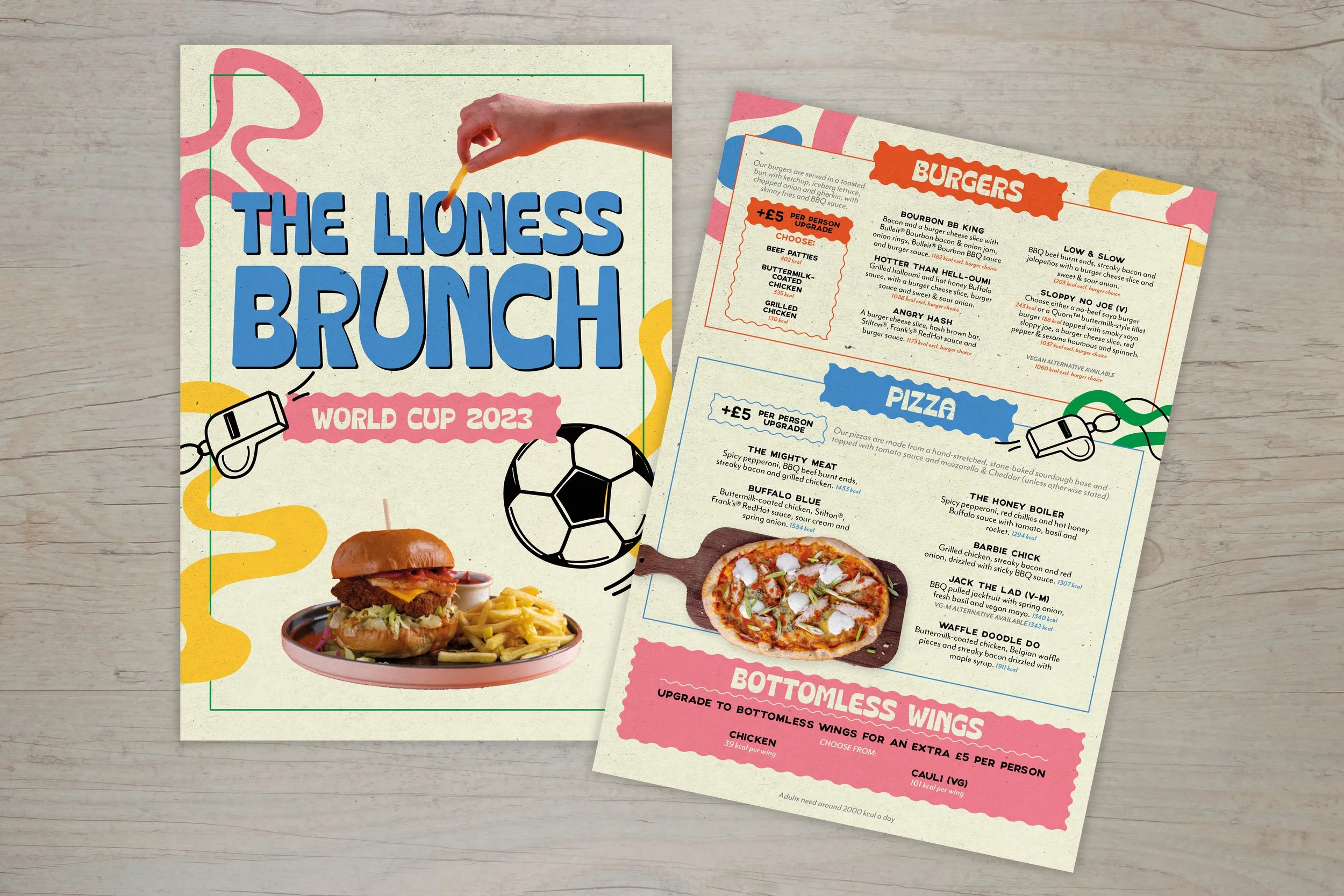 This project was done during my time as a graphic designer at Stonegate Group. A bold brunch campaign launched across Social Pub & Kitchen sites during the 2023 Women’s World Cup, designed to draw in supporters of the Lionesses while matches were airing in-venue. The project was strongly focused on editorial design, with a dedicated brunch menu at its core, supported by social media assets and promotional materials. Using a colour palette inspired by the tournament logo, strong typography and playful compositions were applied across print and digital touchpoints, resulting in a cohesive, timely and inclusive campaign built around food, football and shared moments.