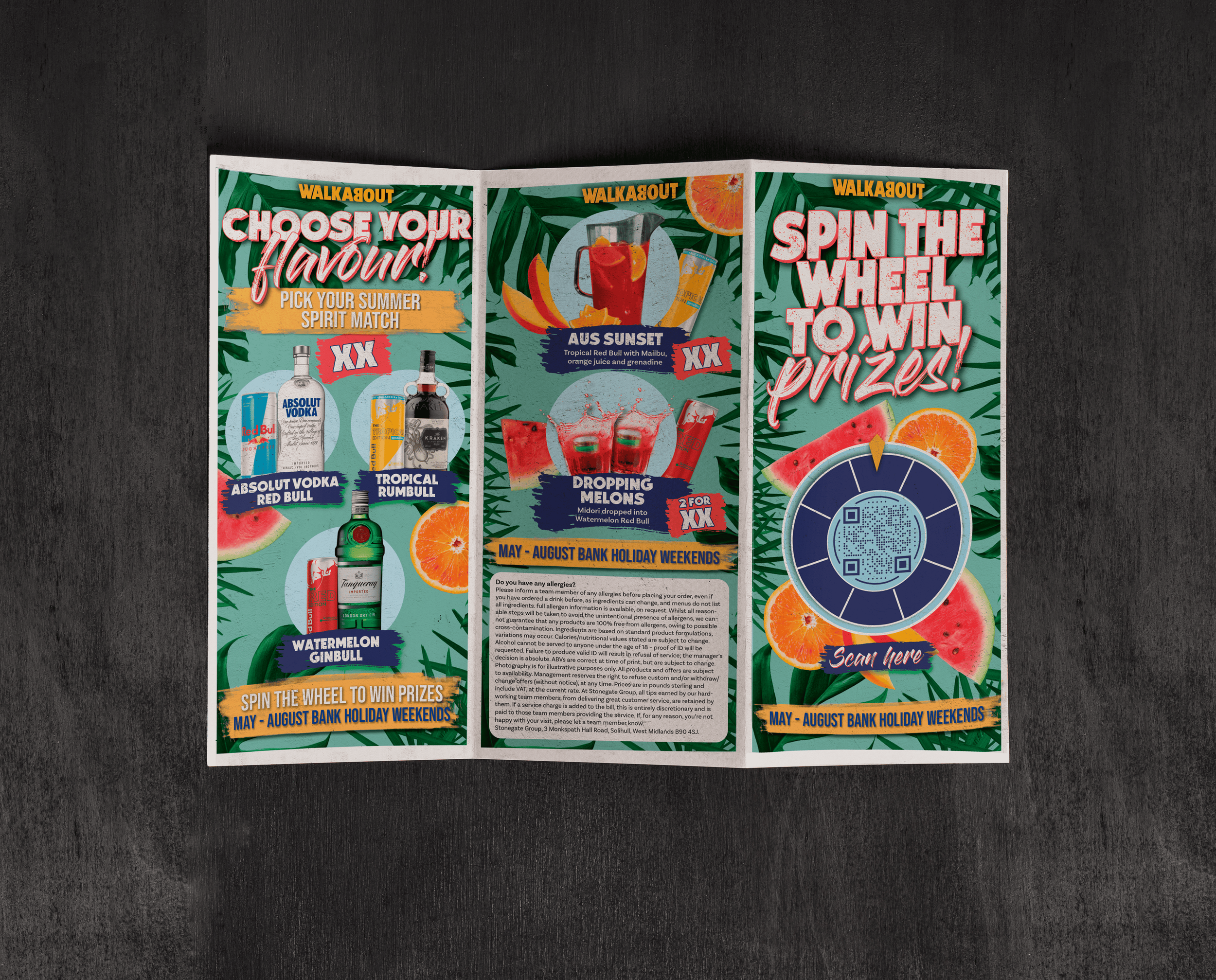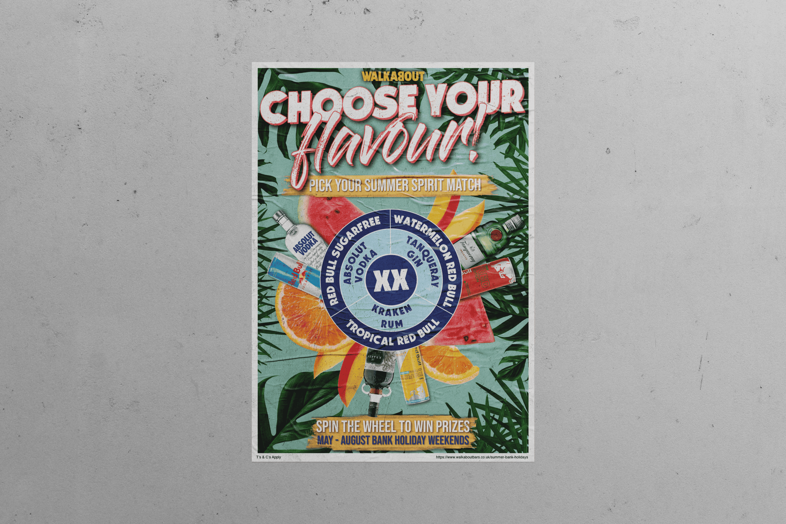 For Walkabout’s summer collaboration with Red Bull, the campaign introduced new flavours through bold in-venue POS and supporting digital assets for social media. Posters and table talkers brought the promotion to life in the bar, while a Spin the Wheel game encouraged customers to engage and try the new flavours paired with their favourite spirits. The result was an eye-catching, high-energy campaign designed to drive interaction and trial at the bar.